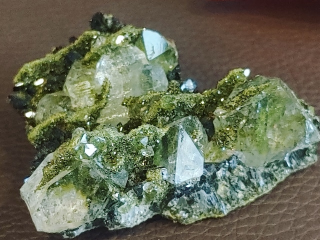 一見、苔と水晶のように見えますが、グリーンの部分はエピドートです。 もうね、地球の美しさがギュギュっと詰まった石ですよ。 エピドートはキラキラ輝いて超きれい! 水晶もクリアでこれまたビューティフル♡ こんなのが出来るって、地球はすごい! いつも思うけど、見つけた人はうれしかっただろうな~。 多くを語るより、ぜひ手にして見て欲しい! いかがでしょうか。 産地 トルコ サイズ 約48×40mm 厚さ 約22mm