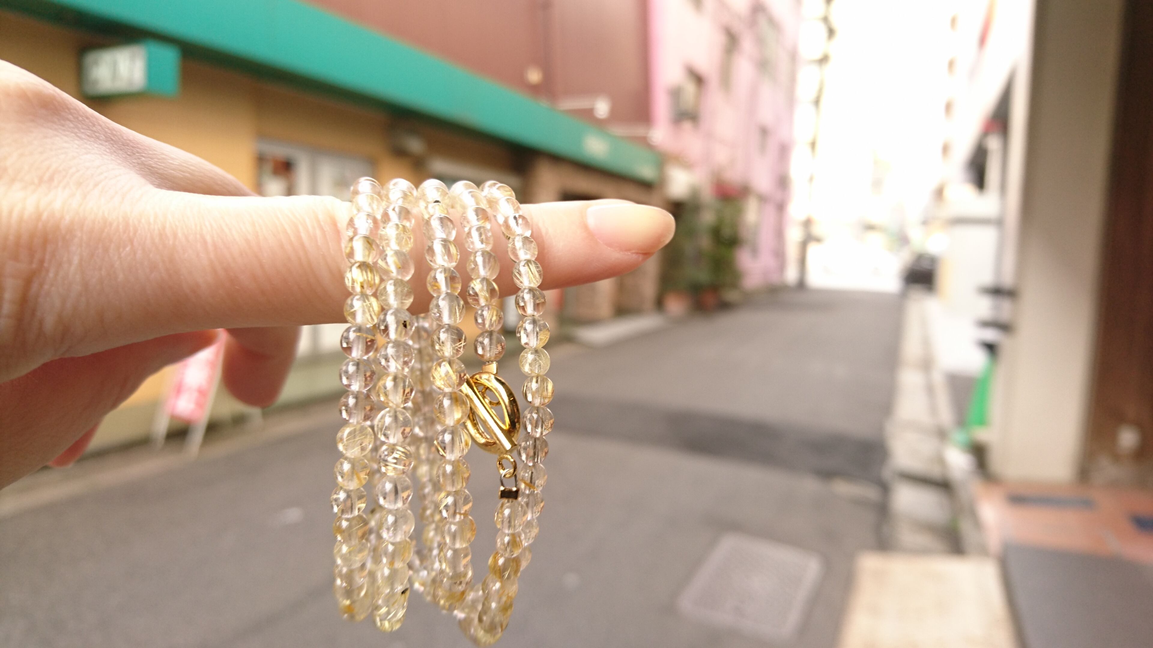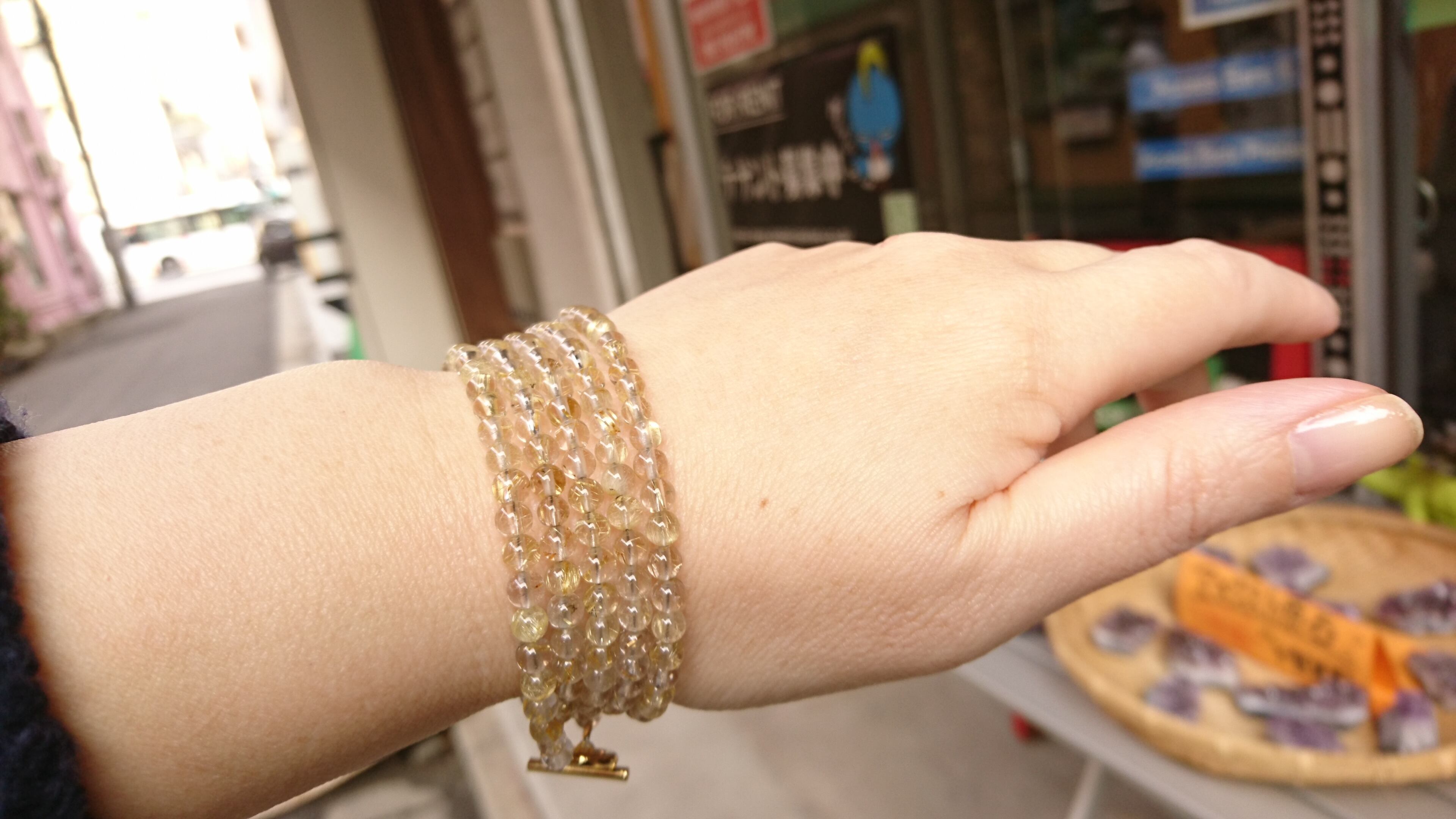 4ミリのルチルを長~くつないで、5重巻きにして着けるブレスレットです。