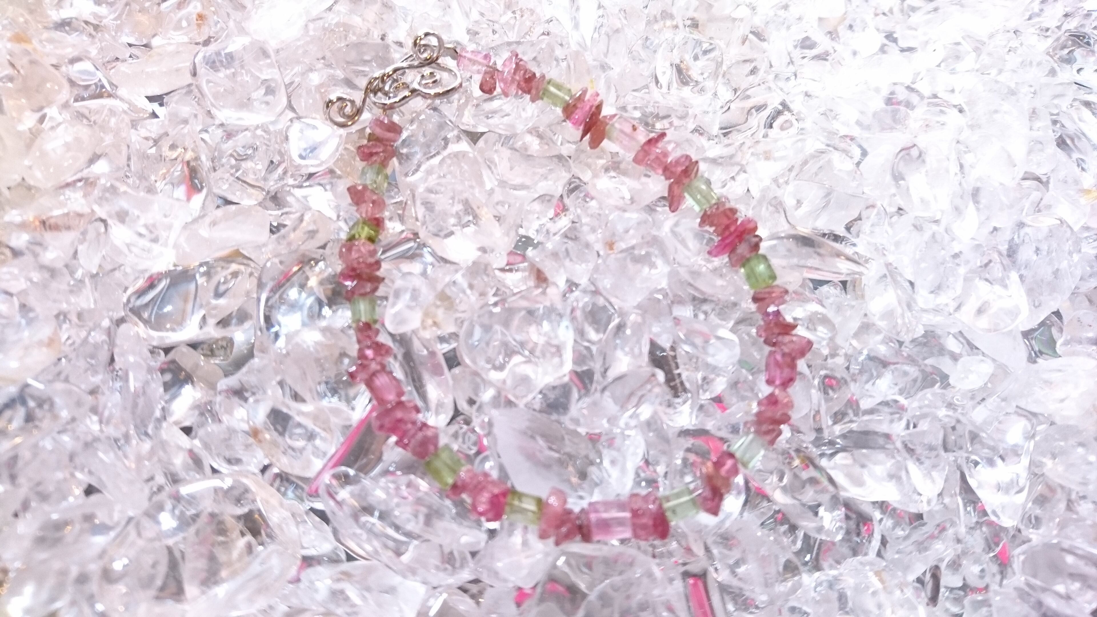 ピンクトルマリンのサザレと、よーく見るとキューブ型のグリーンとピンクのトルマリンのミックスです。